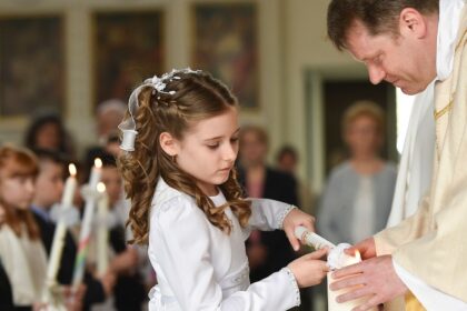 Die letzte Probe ist vorbei. Die Erstkommunionskinder in Regen im Bayerischen Wald,…