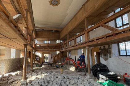 Ein Minibagger im Kirchenschiff, vorne ein Hydraulikhammer. In Bad Rodach wird der…