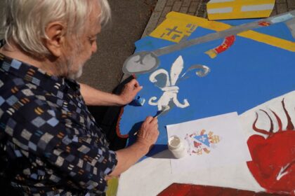 Johannes Buhl tunkt den Pinsel in die weiße Farbe. Im Hof vor…