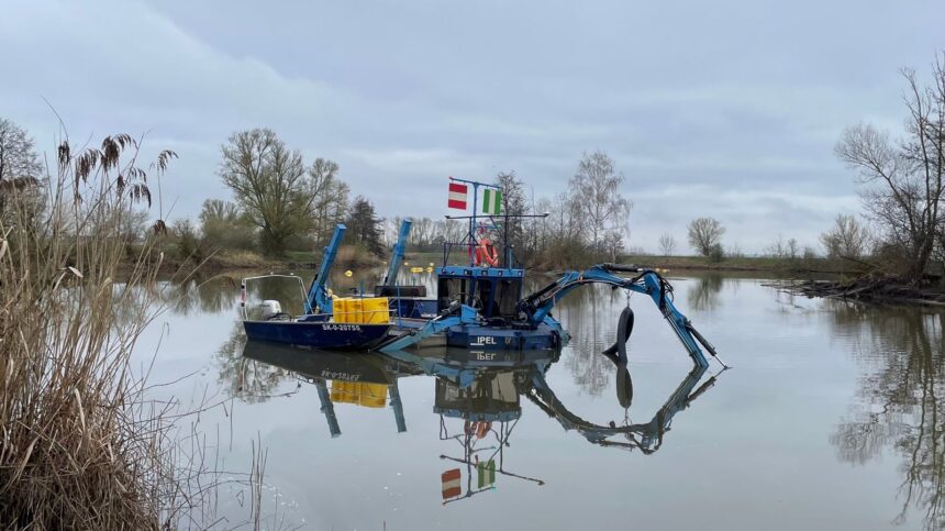 Ein Saugbagger liegt im westlichen Bereich im Altmühlsee im Landkreis Weißenburg-Gunzenhausen vor Anker und saugt Sediment vom Grund des Sees. Seit Oktober vergangenen Jahres ist der Bagger im Einsatz für…