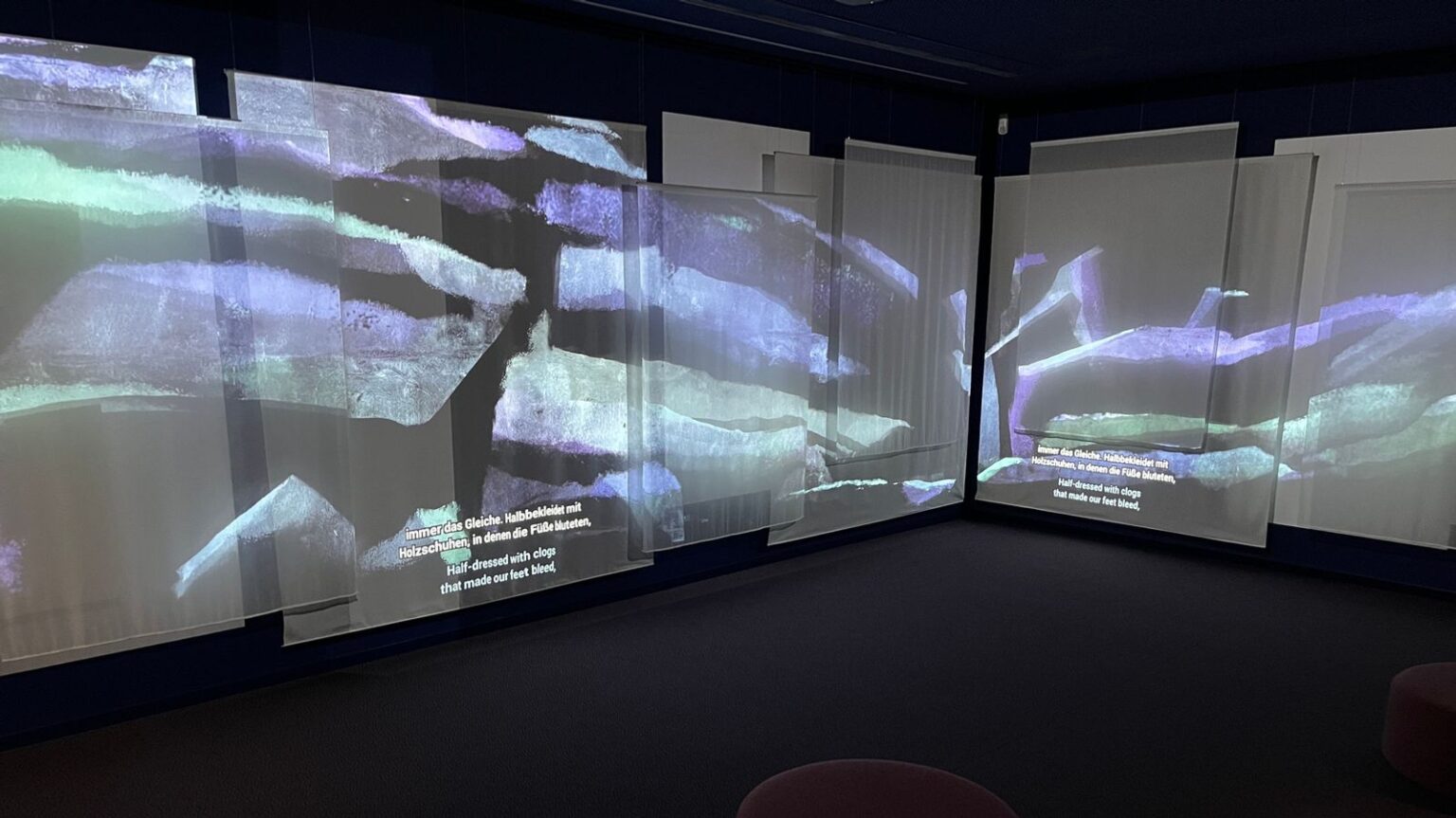 Die Wände sind schwarz in dem kleinen Raum, zwei große Stufen mit runden Sitzpolstern laden zum Platz nehmen ein. Der Blick fällt auf 15 weiße Stoffbahnen, die an den gegenüberliegenden Wänden von der Decke hängen. Es sind Stimmen zu hören: Ehemalige Häftlinge erzählen in ihren jeweiligen Sprachen von ihren Erfahrungen im KZ Flossenbürg und seinen 80 Außenlagern. Die Untertitel werden eingeblendet – auf den Stoffbahnen erscheinen Illustrationen, die sich bewegen. Dazu hat eine Sounddesignerin eine Klangkomposition geschaffen, die die „Zwischentöne“, das „Nichtgesagte“ in den Häftlingserzählungen darstellen soll.