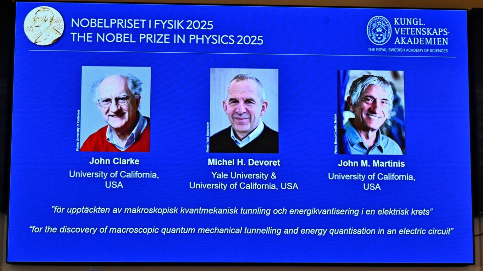 Der Nobelpreis für Physik geht in diesem Jahr an die in den USA forschenden Quantenphysiker John Clarke, an Michel H. Devoret und an John M. Martinis. Sie alle sind an der University of California tätig. Das teilte die Königlich-Schwedische Akademie der Wissenschaften in Stockholm mit.